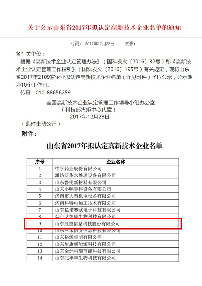 山東展望信息科技股份有限公司經(jīng)過層層嚴(yán)格審查,憑借過硬的研發(fā)實力和創(chuàng)新能力,榮獲了由山東省科學(xué)技術(shù)廳、山東省財政廳、山東省國家稅務(wù)局、山東省地方稅務(wù)局聯(lián)合頒發(fā)的“高新技術(shù)企業(yè)”認(rèn)定證書,是企業(yè)科研實力及科研水平的有力證明。