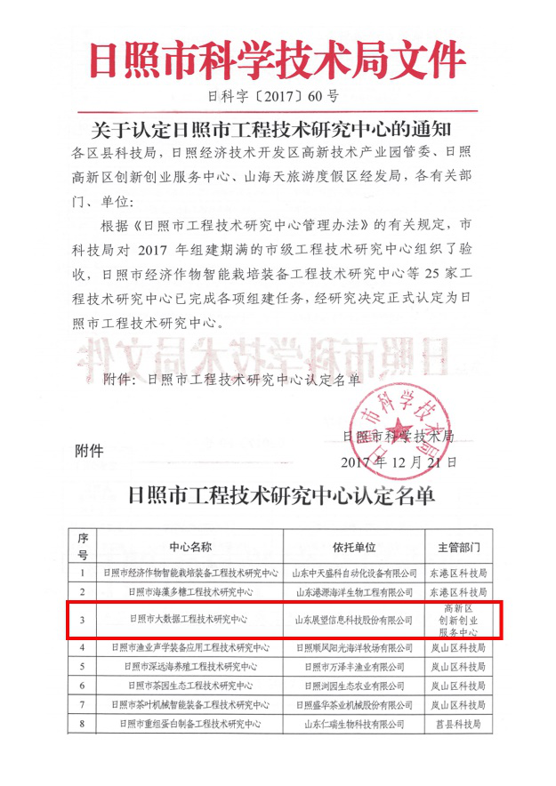 近日,日照市科學(xué)技術(shù)局發(fā)布《關(guān)于認(rèn)定日照市工程技術(shù)研究中心的通知》(日科字2017〔60〕號)。我公司申報的大數(shù)據(jù)工程技術(shù)研究中心經(jīng)過一年的籌備建設(shè),順利通過日照市科技局驗(yàn)收,正式被認(rèn)定為日照市工程技術(shù)研究中心。